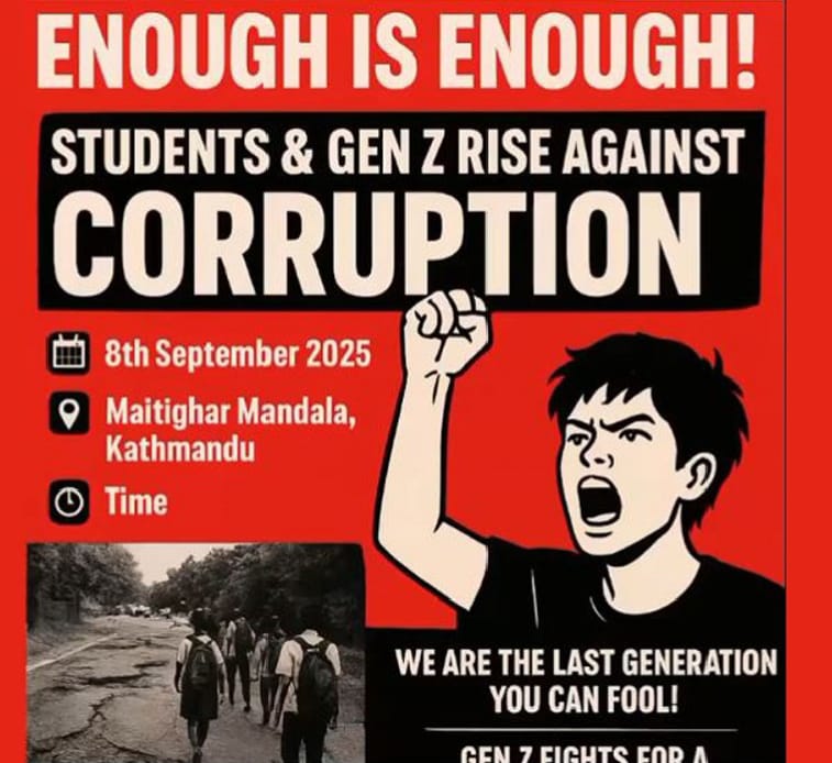 काठमाडौं । अठ्ठाईस बर्ष भित्रका “जेनजी ” पुस्ताले भ्रष्टचार र सामाजिक संजाल बन्दको बिरुद्द भोलि ९ बजे माइतिघर, बानेश्वर क्षेत्रमा बिरोध प्रदर्शन गर्नेभएका छन्। शान्तिपूर्ण आन्दोलनमा पत्रकारहरु, सञ्चार उद्योगीहरु, नागरिक समाजहरू, व्यापारी हरुले पनि आफ्नो उपस्थिति जनाउने भएका छन्। काठमान्डौ म.न.पा. का मेयर बालेन शाहले आफ्नो उमेरको कारण सो आन्दोलनमा जान नसकिएपनी आफ्नो समर्थन रहेको बताएका […]