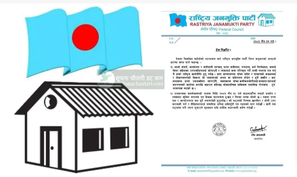 काठमाडौं । राष्ट्रिय जनमुक्ति पार्टी केन्द्रिय समितीको महासचिव टोप अस्लामीले एक बिज्ञाप्ती जारी गर्दै देशलाई अग्रगमनको बाटोमा अगाडि बढाउन प्रतिबद्ध लोकतान्त्रिक शक्तिहरू यथाशिघ्र गोलबन्द हुन आवश्यक भएको बताउनुभएको छ। प्रेस विज्ञप्ति देशमा विकसित भईरहेको घटनाक्रम बारे राष्ट्रिय जनमुक्ति पार्टी निम्न अनुसारको आफ्नो धारणा स्पष्ट पार्न चाहन्छ :- १) लामो संघर्ष, आन्दोलन र बलीदानी पश्चात् प्राप्त […]
