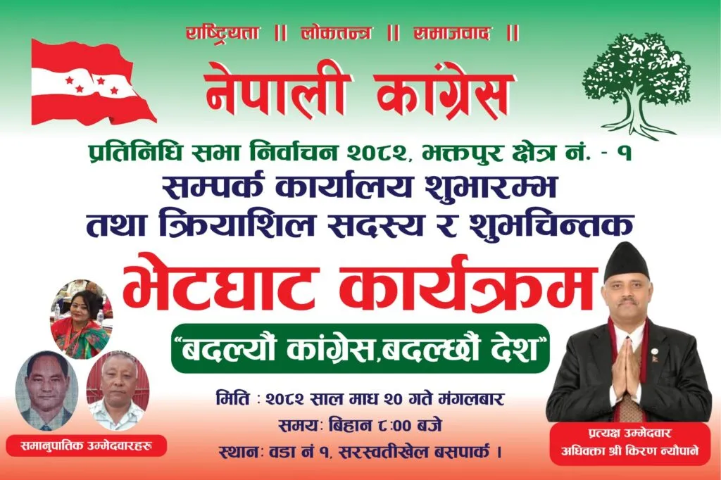 भक्तपुर। आगामी फागुन २१ गते हुने प्रतिनिधिसभा सदस्य निर्वाचनलाई लक्षित गर्दै दुई निर्वाचन क्षेत्र रहेकाे भक्तपुर कांग्रेसले निर्वाचन क्षेत्र नं. १ मा प्रत्येक्ष तर्फ अधिवक्ता किरण न्याैपाने साथै समानुपाति तर्फ डा. गंगा लक्ष्मी अवाल , बिनाेद प्रकाश कायष्ठ र मदन कृष्ण श्रेष्ठलाई उमेदवार बनाएकाे छ भने, चुनावी प्रचारका लागि निर्वाचन क्षेत्र १ भरि सम्पर्क कार्यालय […]