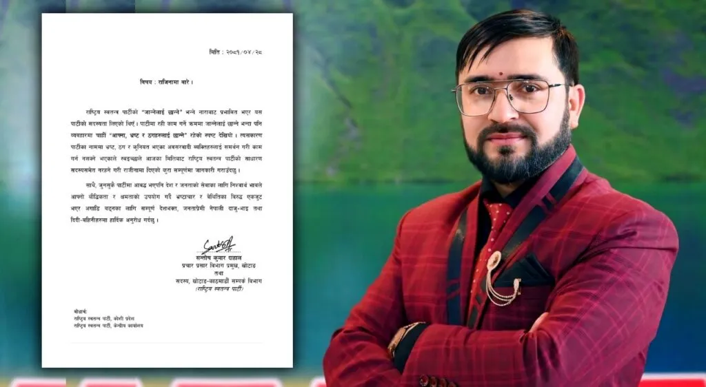 काठमाडौँ । राष्ट्रिय स्वतन्त्र पार्टी, खोटाङका प्रचार–प्रसार विभाग प्रमुख तथा खोटाङ काठमाडौँ सम्पर्क विभागका सदस्य सन्तोषकुमार दाहालले राष्ट्रिय स्वतन्त्र पार्टीको साधारण सदस्यसमेत नरहने गरी पार्टीबाट राजिनामा दिएका छन् । दाहाल करिब डेढवर्षदेखि राष्ट्रिय स्वतन्त्र पार्टीमा आवद्ध भएका थिए । दाहालले आफ्नो फेसबुक पेजमार्फत राष्ट्रिय स्वतन्त्र पार्टी परित्याग गरेको राजिनामा पत्र सार्वजनिक गरेका हुन् । राजिनामा […]