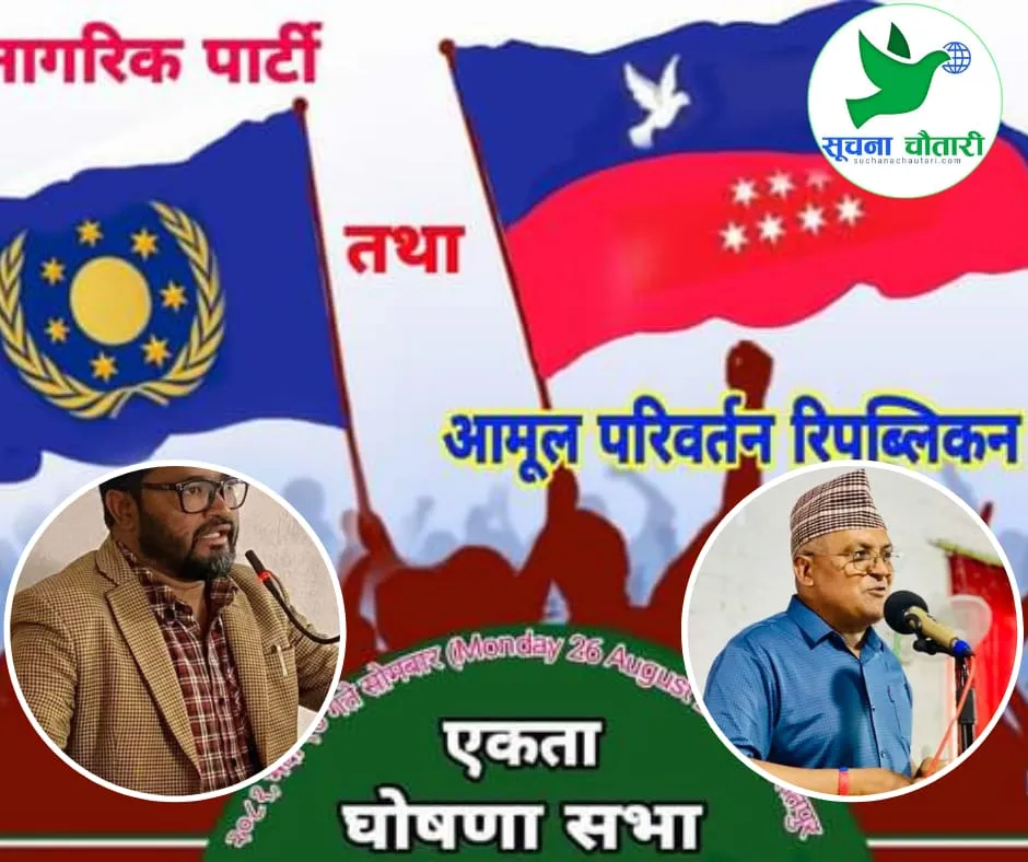 काठमाडौं । विभिन्न समय र दलहरु सँगकाे छलफल तथा एकता प्रायस पछि अन्तत संयुक्त नागरिक पार्टी र आमूल परिवर्तन रिपव्लिकन पार्टीबिच पार्टी एकता भएको छ। ललितपुरकाे धाेबिघाट स्थित सिद्धार्थ कटेजमा आज आयोजित कार्य क्रममा दुई पार्टी बिचकाे एकता घोषणा भई आमूल परिवर्तन नागरिक पार्टी नामाकरण गरिएको छ। आमूल परिवर्तन रिपब्लिकन पार्टीका अध्यक्ष भरत गिरि तथा […]