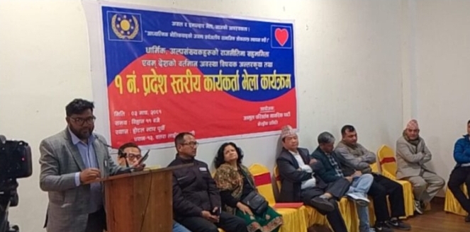 धरान। आमूल परिवर्तन नागरिक पार्टीको धार्मिक तथा अल्पसंख्यकहरुकाे राजनीतिमा सहभागिता तथा देशकाे वर्तमान अवस्था विषयक अन्तरक्रिया र १.न. प्रदेश स्तरीय कार्यकर्ता भेला धरानको स्टार पूर्वी होटेलमा सम्पन्न भएको छ। कार्यक्रममा पार्टीका वरिष्ठ नेता कमला हेम्चुरीले धार्मिक अल्पसंख्यक तथा सीमान्तकृतहरुको वर्तमान अवस्था र राजनैतिक पहुँच बारे कार्य पत्र प्रस्तुत गरेका थिए भने कार्यक्रममा स्वागत मन्तब्य पार्टी […]