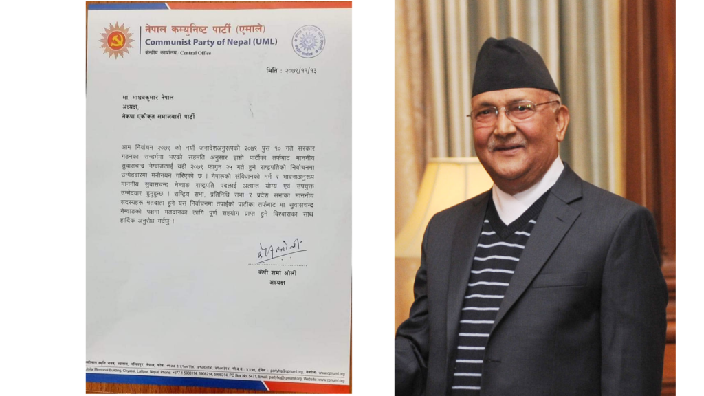 काठमाडौं । राष्ट्रपति निर्वाचनलाई लिएर नेकपा एमालेले नेकपा एकीकृत समाजवादीलाई औपचारिक पत्र पठाएको छ । एमालेद्वारा नेकपा एकीकृत समाजवादी औपचारिक रुपमा पार्टी स्वीकार गरी पत्रै पठाएकाे भने पहिलो पटक हाे । एमालेले नेता सुवास नेम्वाङले राष्ट्रपतिमा उम्मेदवारी दिए लगतै एमालेले एकीकृत समाजवादीलाई औपचारिक पत्र पठाएको हो । राष्ट्रपति निर्वाचनमा सहयोग माग्दै एमालेले १० पुसको सहमतिलाई पनि आधार बनाएको […]